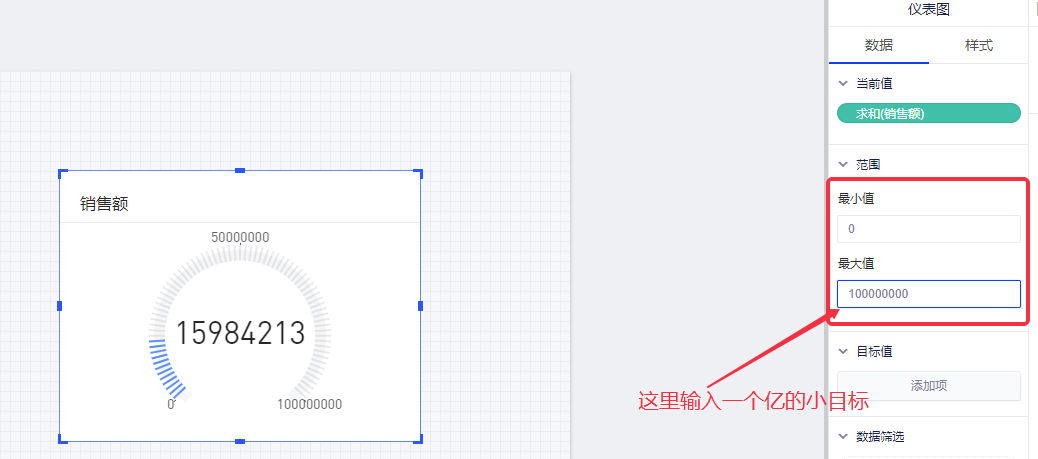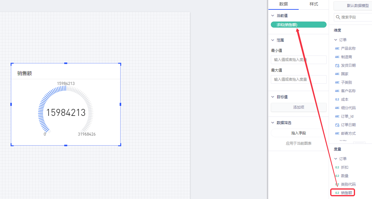 (2)拖入一个度量字段“销售额”,代表用户希望在仪表图中显示的动态变化指标;