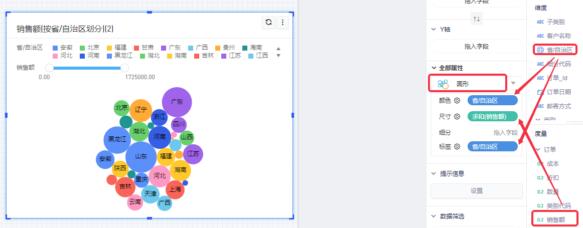 (2)将“省/自治区”拖入属性面板的颜色和标签项,将“销售额”拖入属性面板的尺寸项,再将图表类型选择为“圆形”,即初步完成气泡图的绘制;