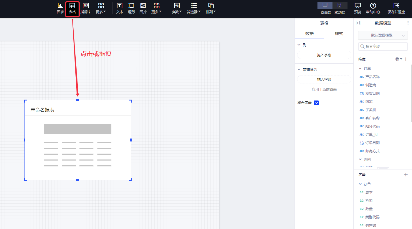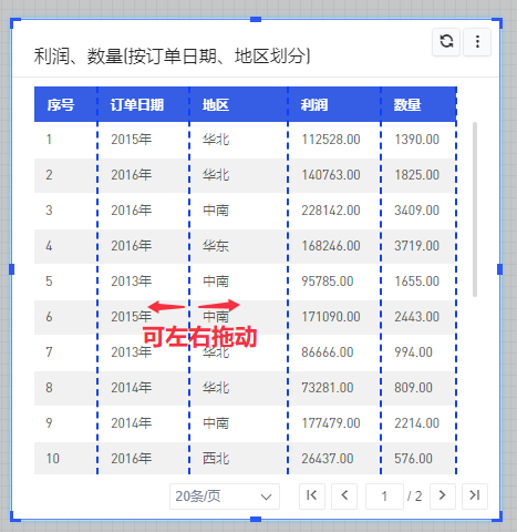 通常用于展示数据的详细信息或多个具有直接关系数值的场景下。以默认数据模型为例,展示各个年度、各地区的销售额、利润、数量,将涉及到4个字段: 维度“订单日期”、“地区”,度量“利润”、“数量”。