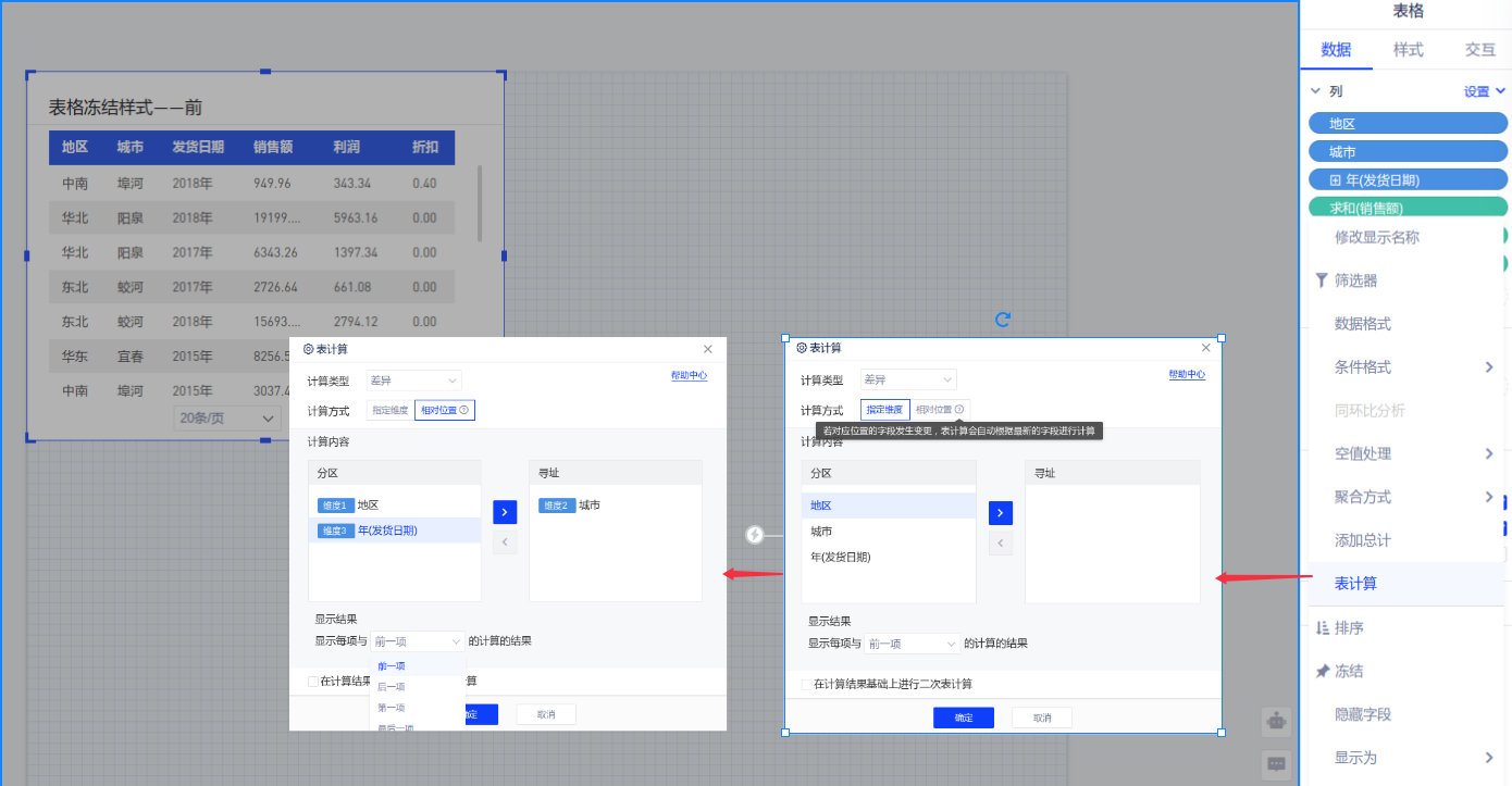 - 相对位置:选择指定的分区、寻址位置:维度1代表表格组件中第1个维度字段,维度n代表表格组件中第n个维度字段