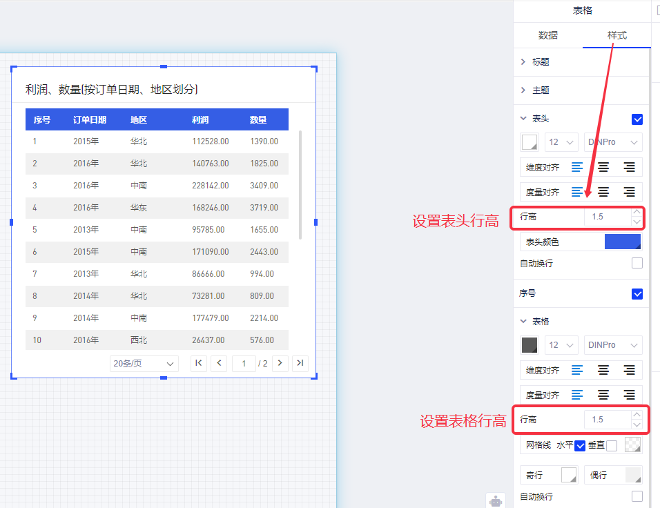 (5)表格支持调整行高,点击“样式”,在表头和表格面板操作行高调整按钮,可以自行调整行高,如图所示;