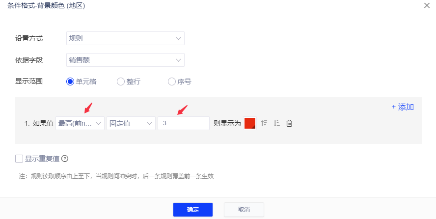 - 支持对某字段满足条件的前n项设置条件格式,例如将销售额最高的三个地区值标红(暂不支持表计算字段)。