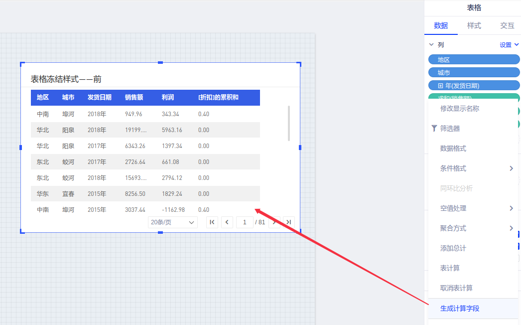 表格支持总计计算,意为可对视图已经聚合的数据进行平均、求和、最大值、最小值等计算。这里以求利润的平均值为例,在字段“利润”上右键呼出菜单,操作示意如下: