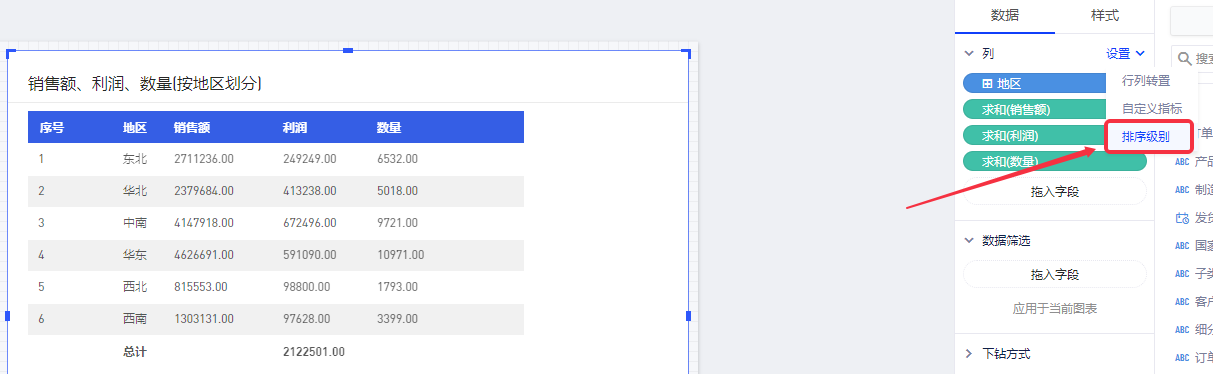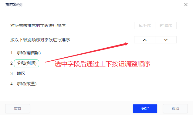 排序级别里提供【对所有未排序字段进行排序】功能,点击“升序”或“降序”后,将对所有字段都执行排序。执行过排序的字段将排列在下方,默认级别顺序按照数据面板上的字段顺序排列,也可对字段进行单独的排序设置,如图所示。