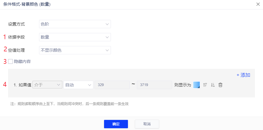 - 依据字段:当前字段可以依据其他字段的值来显示条件格式。例如地区字段可以依据销售额大小来显示条件格式,将销售额大于10000的地区字段标红。