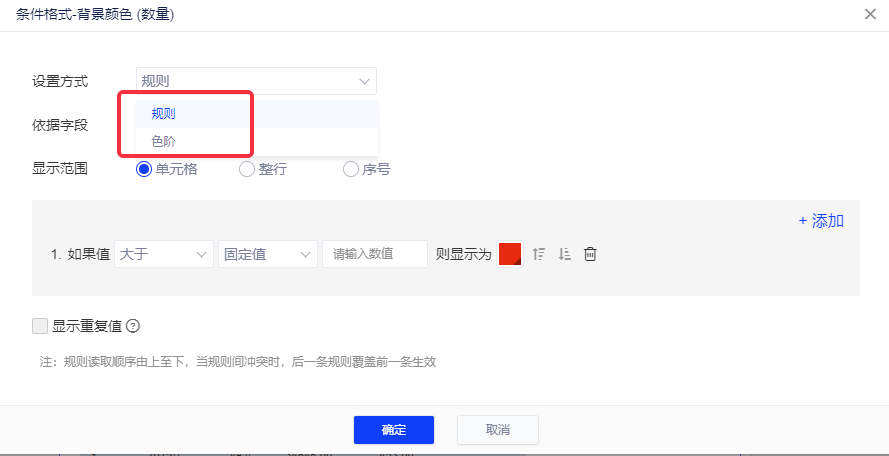 - 显示范围:可以选择单元格、整行或序号。即设置条件格式应用的范围,是仅单元格,还是单元格所在的整行数据,或者单元格所在的序号字段(勾选显示序号后序号才会生效)。