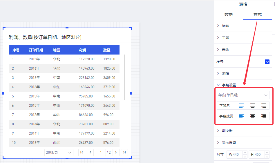 (6)表格支持单列对齐方式选择,点击“样式”-“字段设置”,可选对应字段名、字段成员,并且分别为其设置对齐方式,如图所示;