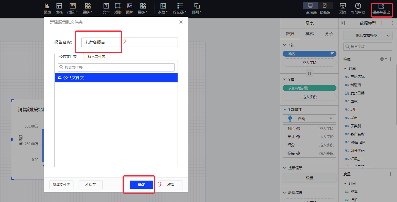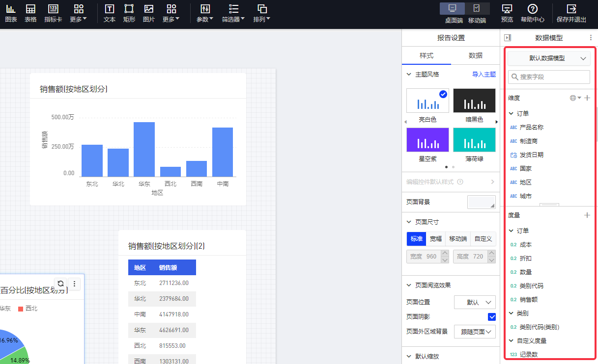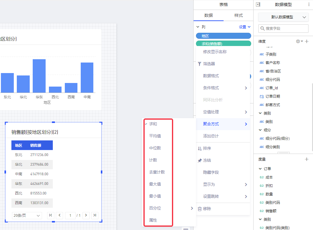 例如:查看每个地区的销售额,则可将"地区"配为维度,将"销售总额"(即销售额之和)配为度量。