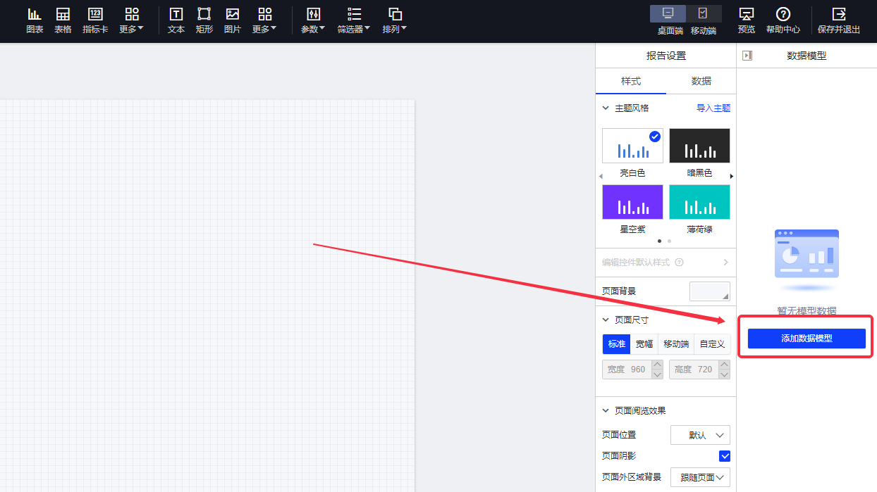 在右侧字段列表区,点击[添加数据模型],选择您在数据源模块已建好的数据模型(如果您是初次体验或测试产品,也可在列表中选择系统提供的"默认数据模型")。