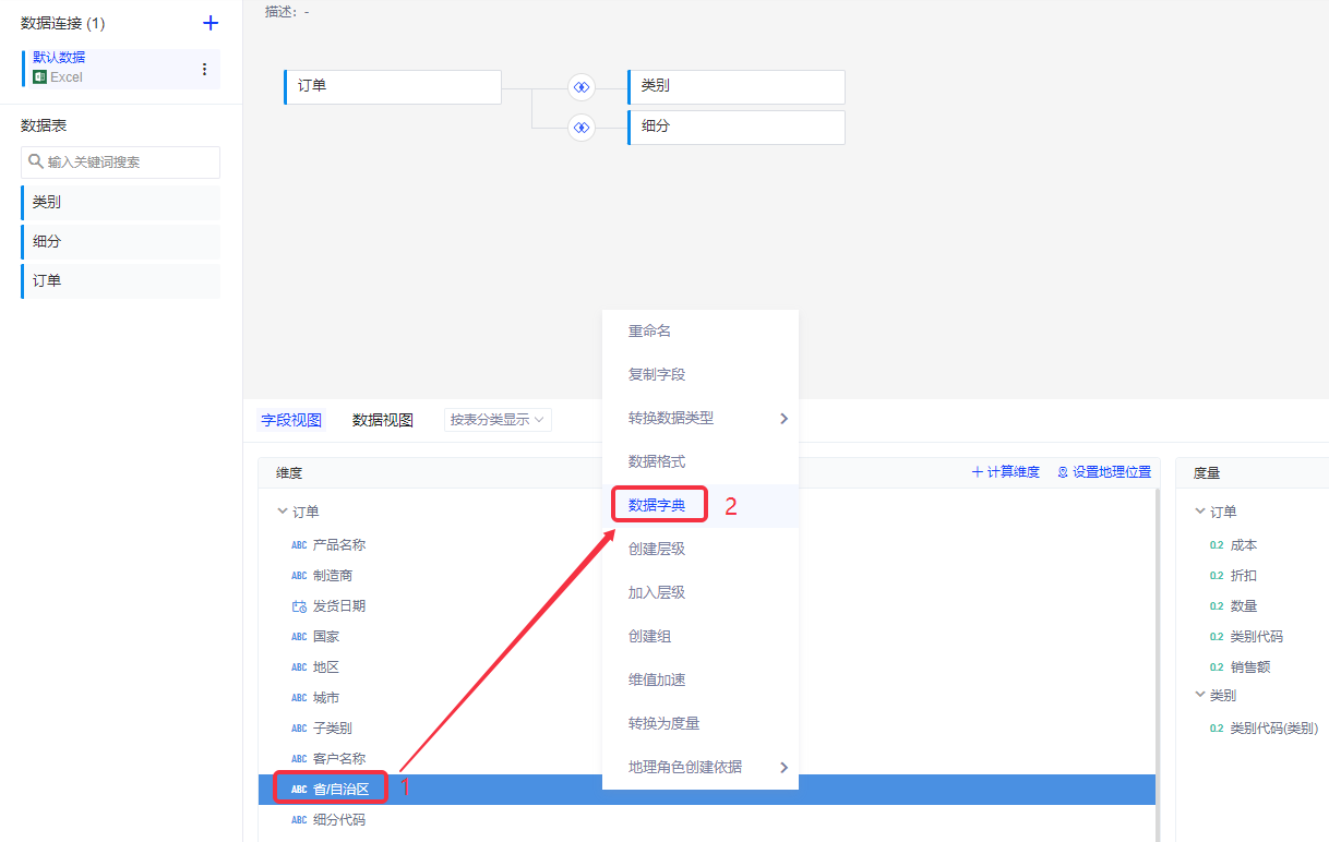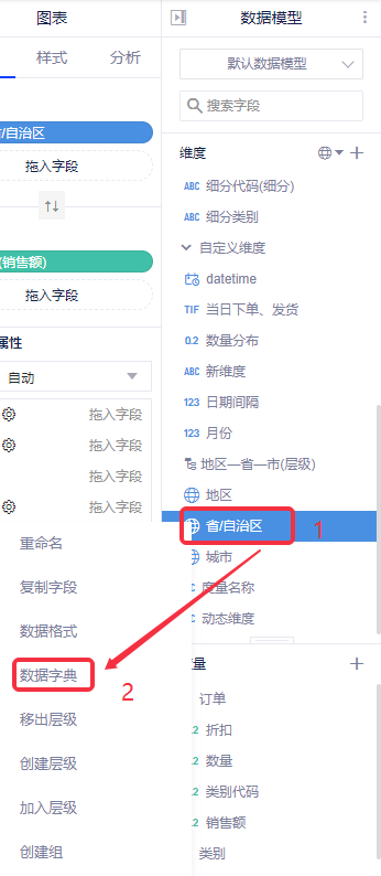 ② 数据模型:在维度中选择“省/自治区”字段,下拉列表选择“数据字典”;