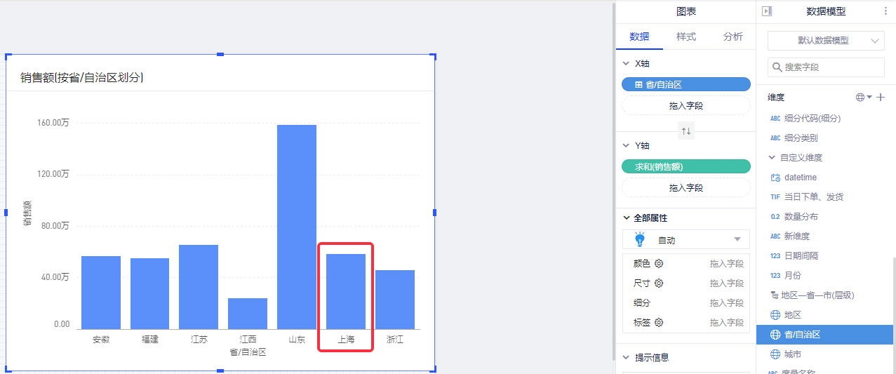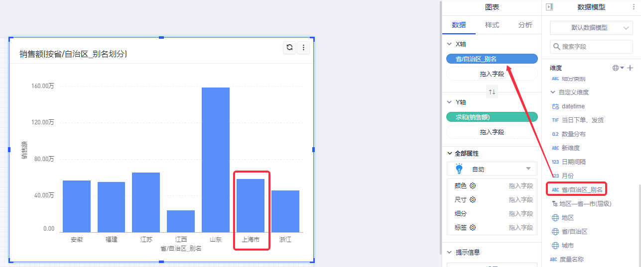(5)将行列面板中的维度字段“省/自治区”替换为“省/自治区_别名”,从图表上来看,“上海”已经改成了“上海市”。