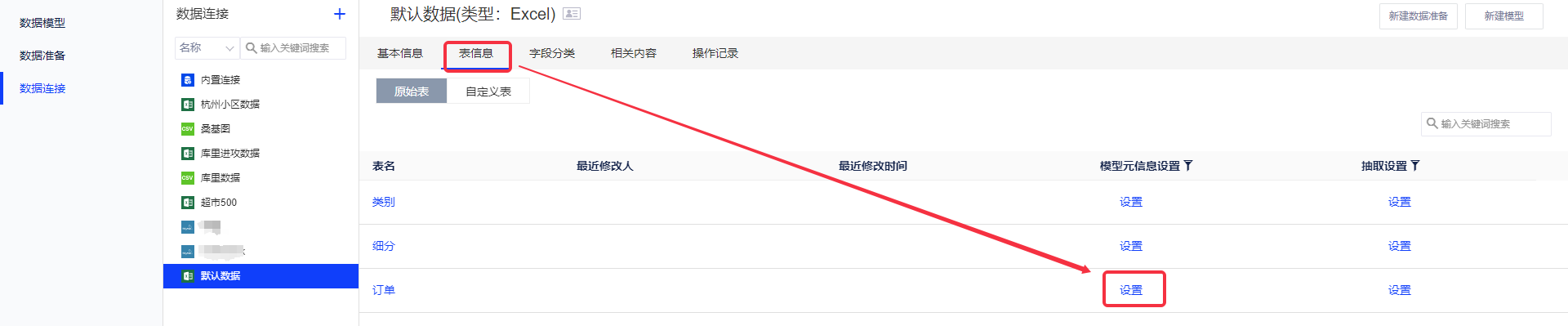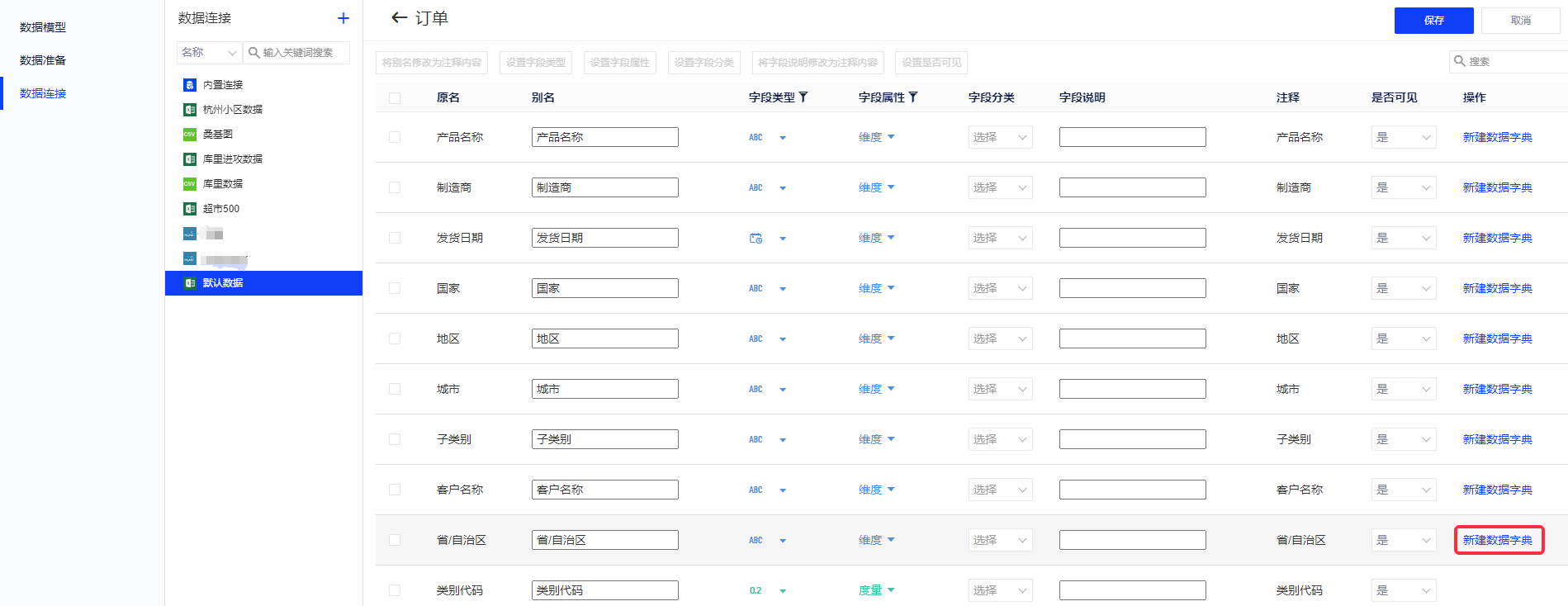 ③数据连接:表信息中选择订单表,字段设置中对于“省/自治区”字段操作选择“新建数据字典”