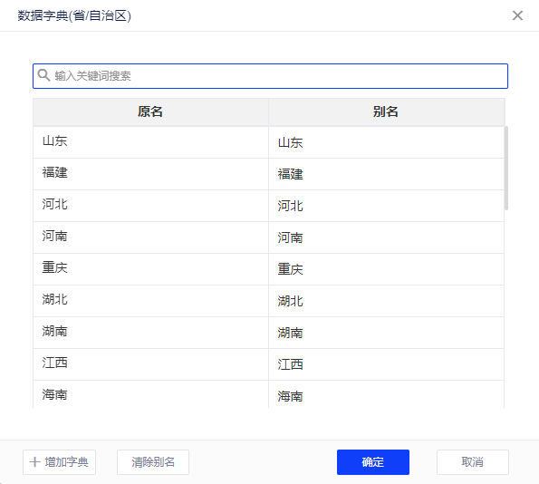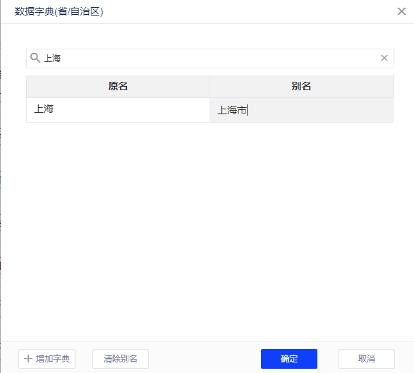点击新增字典后,在字典首行新增输入框,可以输入对应添加的原名及别名,原名及别名不允许重复,选择后方“x”号,可以进行整行删除。