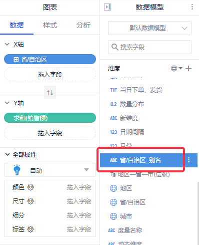 (4)点击确认后,可以发字段列表区自定义维度中多了一个新字段“省/自治区_别名”