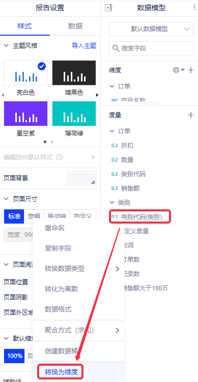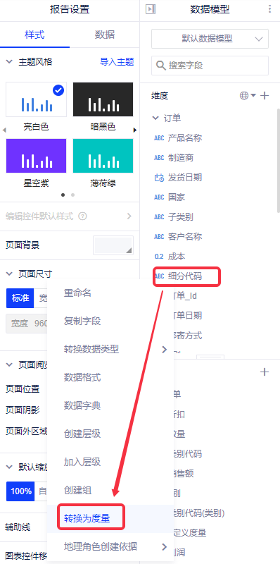 1. 概述2. 操作步骤1. 概述您可以将度量字段转换为维度,也可将维度字段转化为度量字段。 2. 操作步骤(1)维度转为度量 在维度列表中右单击需要转化的字段,在出现的弹出菜单中选择“转化为度量”即可。 (2)度量转为维度 在度量列表中右单击需要转化的字段,在出现的弹出菜单中选择“转化为维度”即可。