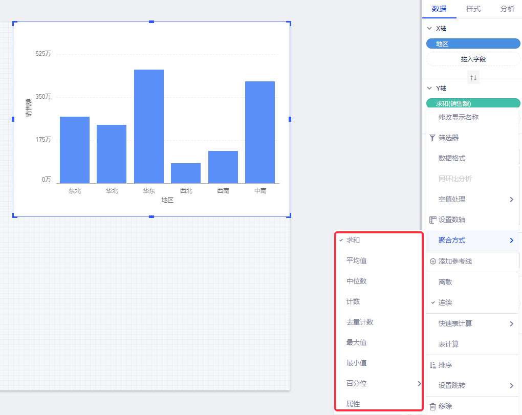 以下图为例,鼠标移动到y轴的“销售额”,Hover点击下拉菜单,选择“聚合方式”,在弹出菜单中可以发现默认的聚合方式为“求和”,您可以直接选择其他聚合方式。