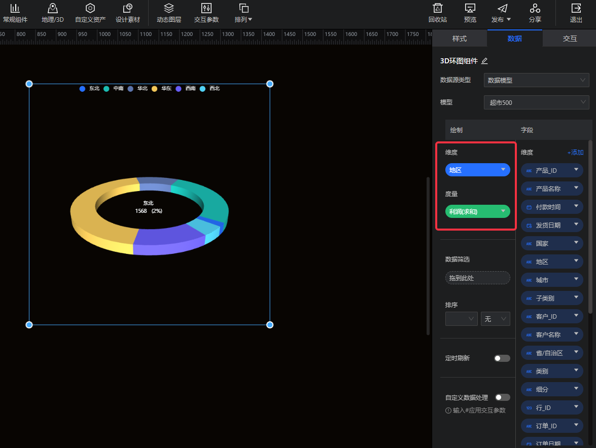 - 维度:设置3D环图的维度字段,如下图所示为“地区”。