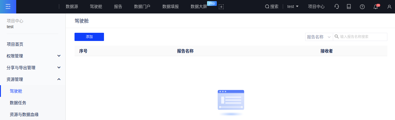 在报告的阅览状态下,单击页面右上角的驾驶舱图标,选择“管理驾驶舱”菜单项跳转到驾驶舱管理列表。您可以查看当前项目所有驾驶舱包含的报告、接收者、创建人等各项信息,并且可以编辑和删除各个驾驶舱。