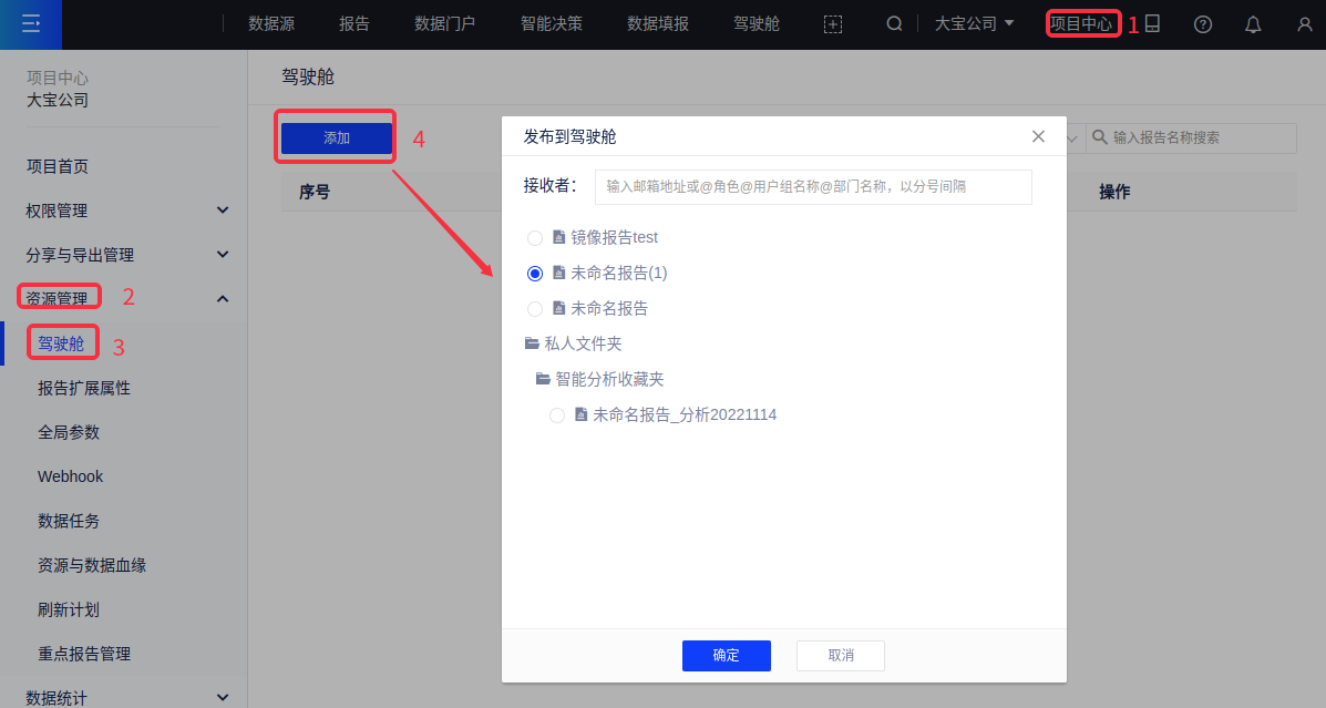 (3)在项目中心-资源管理-驾驶舱页面,点击左上方“添加”按钮,在弹出的窗口中,可以选择将哪些报告发发布到哪些邮箱地址、用户组、角色和部门的驾驶舱;