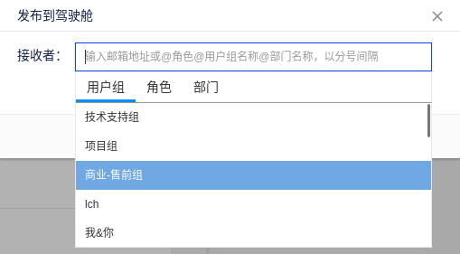 (2)在弹出的窗口中,可以选择将报告发布到哪些邮箱地址、用户组、角色和部门的驾驶舱;