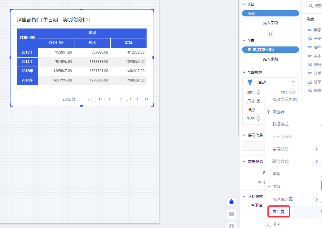 (1)首先把要计算的“销售额”拖拽到配置面板上,并点击小三角(或右键)呼出菜单找到表计算菜单选项;
