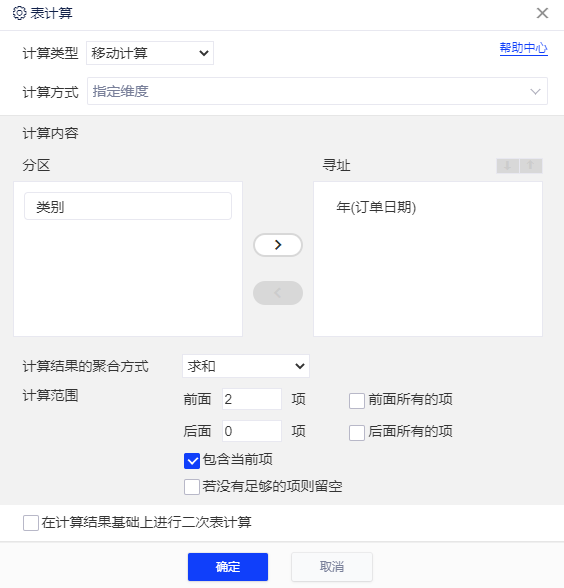 - 除了可以指定聚合计算的类型(前后多少项,是否包含当前项),还可以选中包含前面所有项或后面所有项。若没有足够的项则留空: 当前面或后面没有能够满足移动计算的足够数量的项时,不进行计算留空。