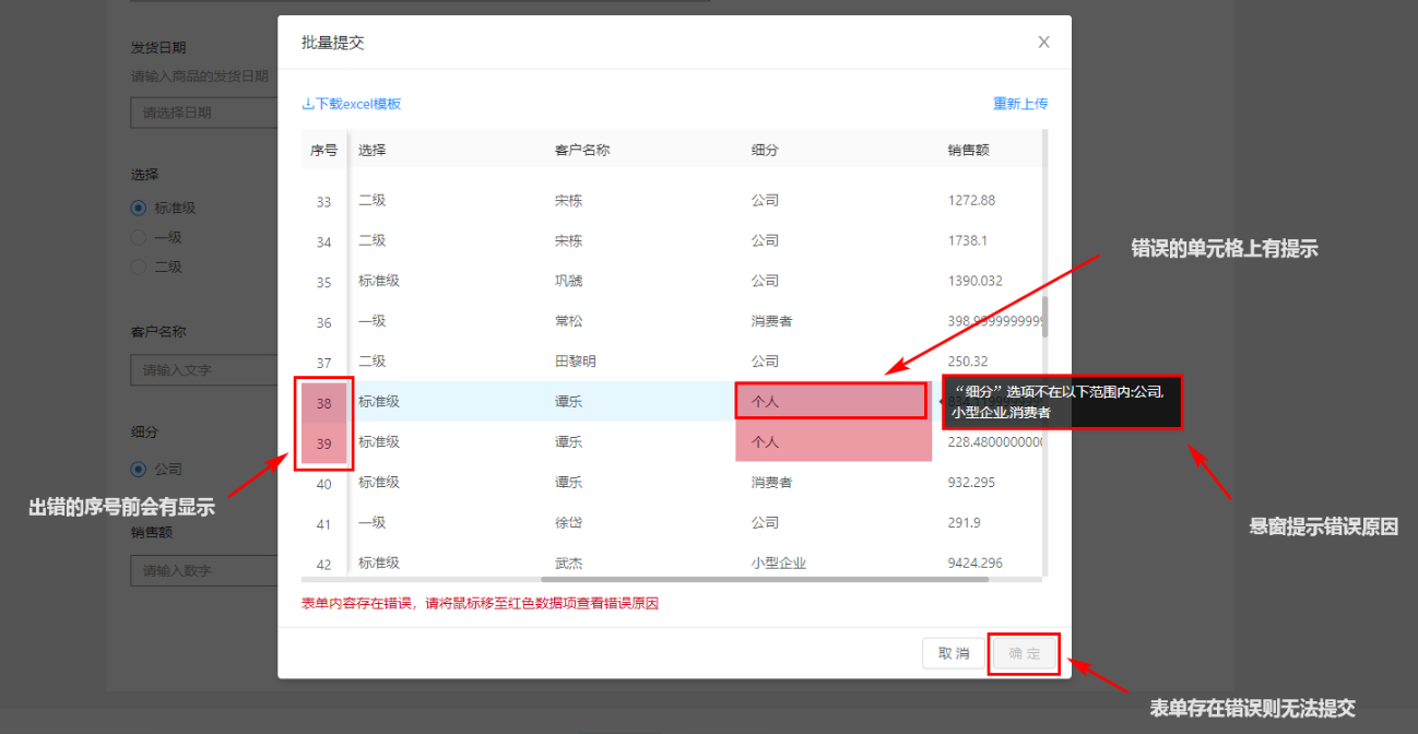 (2)将需要上传的批量数据输入到模板中,然后点击或者拖曳上传文件,在批量提交界面可以预览数据。如果填报的内容不符合表单的要求,在预览区会突出显示,同时该文件无法上传。将鼠标置于填报错误单元格上会显示出错原因