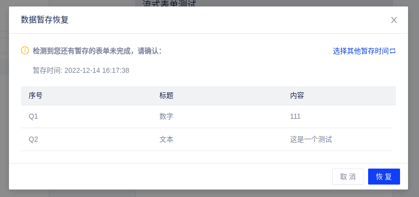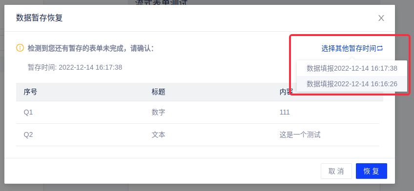 (3)若没有点击继续填写,再次打开填写页面,可以选择数据暂存恢复