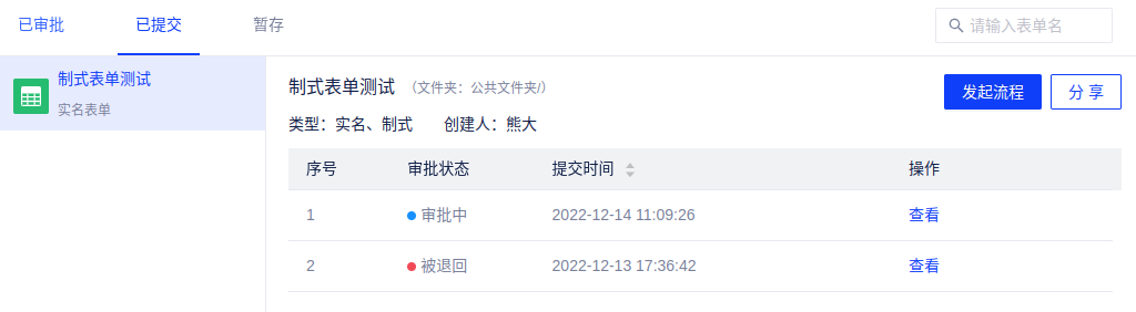 在“已提交”页面下,可以看到具体的表单数据、审批状态、提交时间、审批人。