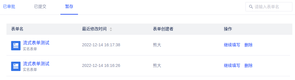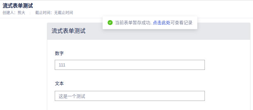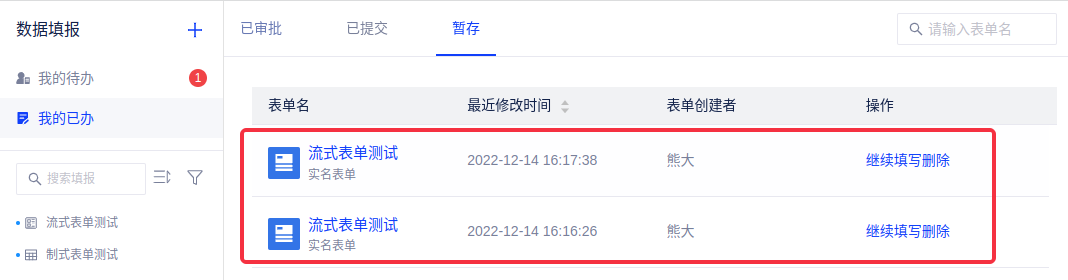 如果您开启了“表单暂存”功能,则用户在填报时可以将填写的数据暂时保存。