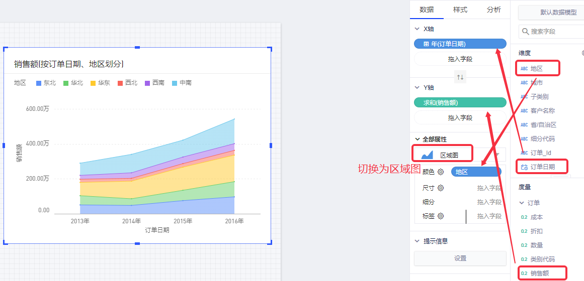 以默认数据模型为例,查看“每个地区每年销售额情况“区域图,将涉及到3个字段:维度“地区”,维度“订单日期”,度量“销售额”。