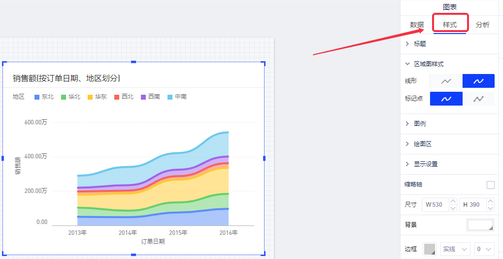 (2)在图表的数据面板的操作:将维度“订单日期”放置在X轴,度量“销售额”放置在Y轴,属性面板上选择“区域图”,将维度“地区”放到属性面板的颜色项内,即得到区域图。