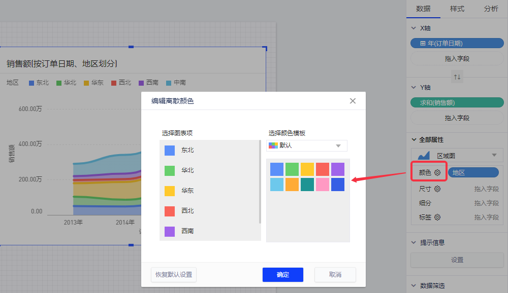 (3)点击“颜色”右侧的图标,可以给区域图设置相应的颜色,产品内置多种配色方案。