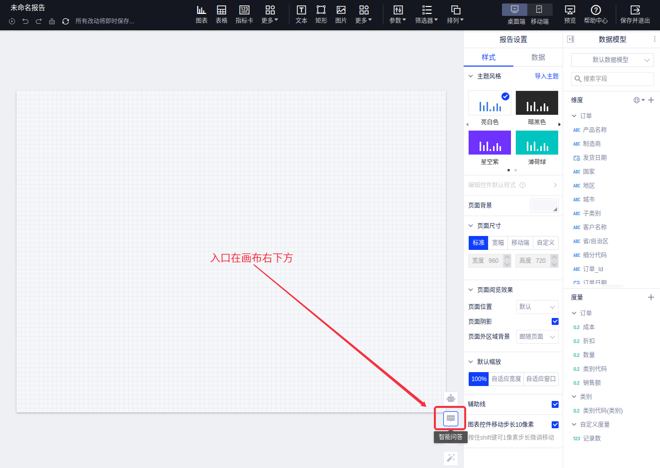 当您进入报告页编辑页面时,可在画布右下方工具栏中找到智能问答入口(如果没有添加数据模型,则功能不可用,这里以默认数据模式为例)。
