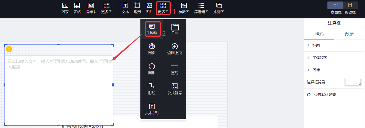 1. 概述2. 快速入门1. 概述通过注释框控件,您可对某些特殊的点作批注,可将注释框添加在报告的任意位置,鼠标移动到控件上,即会浮窗显示提示信息。效果如下图所示: 本文为您介绍如何创建并设置注释框控件。 2. 快速入门(1)在画布上画出一个空白的注释框控件; (2)双击进入注释文本编辑页面,添加注释文字,输入#号可插入动态时间,输入* 号可插入度量,如下图所示; (3)支持修改符号形状颜色、背景颜色、边框颜色和注释框背景颜色,如下图所示。