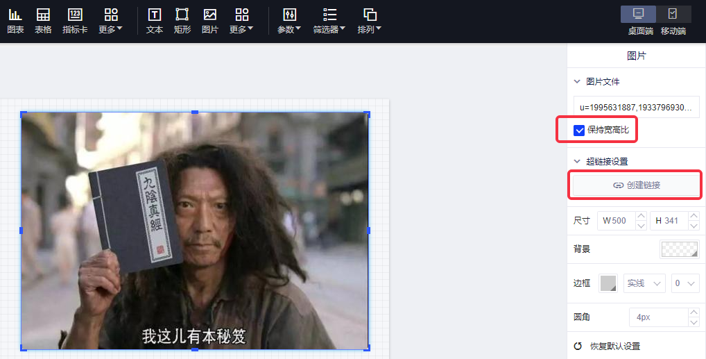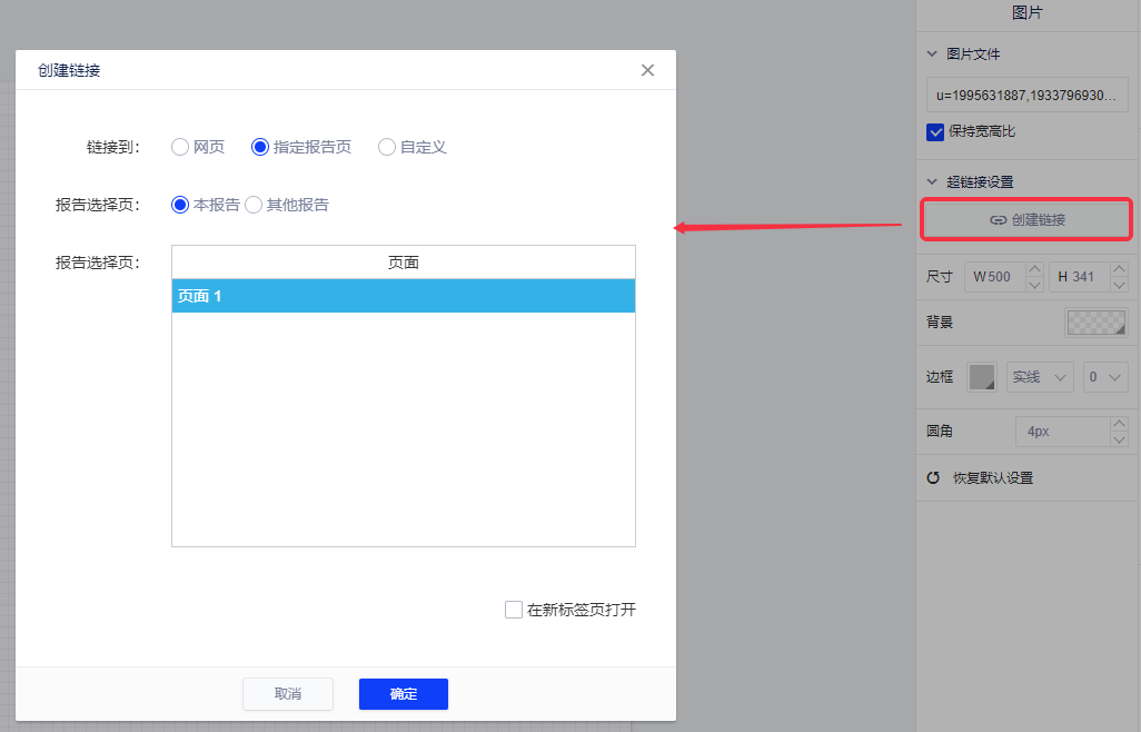 1. 概述2. 快速入门1. 概述图片控件可以帮助您在报告中添加图片元素,展示图片。 2. 快速入门(1)点选顶部的图片控件后,系统会自动弹出选择框,让您选择需要上传的图片; (2)上传完成后,您可任意调整图片大小,在右侧的图片设置面板中,可设置保持宽高比(默认勾选)、更改图片的边框、圆角大小等; (3)在右侧的图片设置面板中,点击“创建链接”按钮可设置图片的链接,支持网页、报告页、自定义JSON三种链接类型。