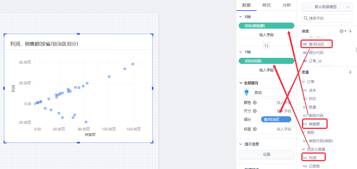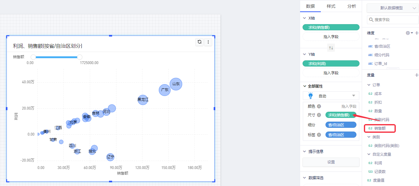 以默认数据模型为例,查看各省的销售额、利润情况,将涉及到3个字段:维度“省”,度量“销售额”、“利润”。