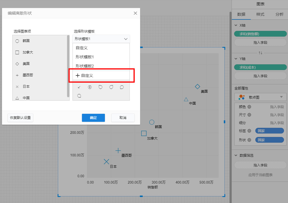 - 属性面板尺寸:每个圆的大小表示了该省份的销售额情况。5. 自定义形状
