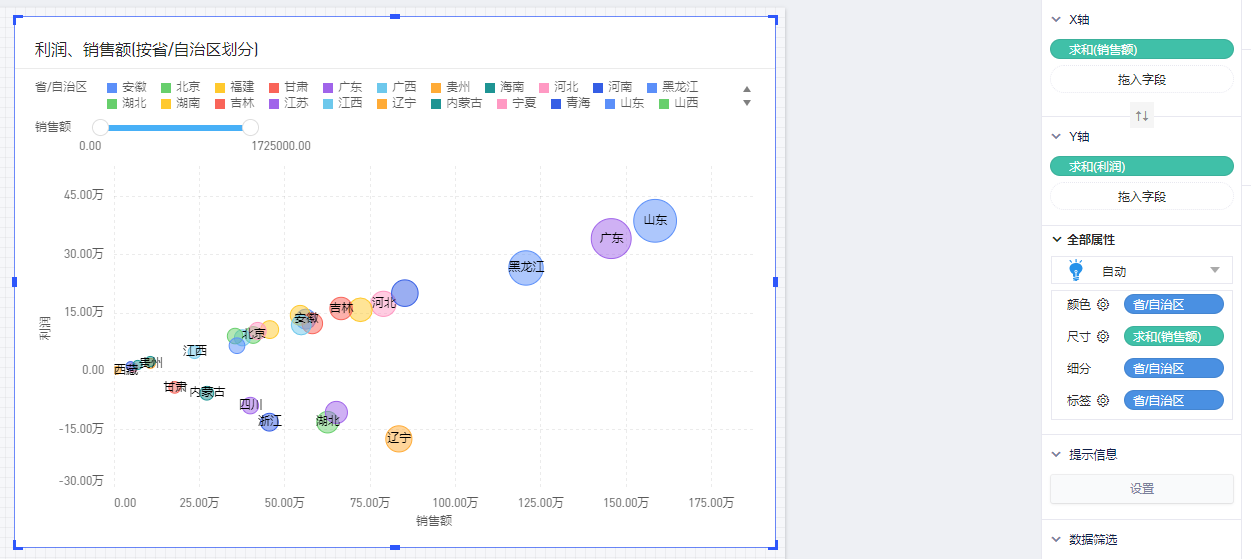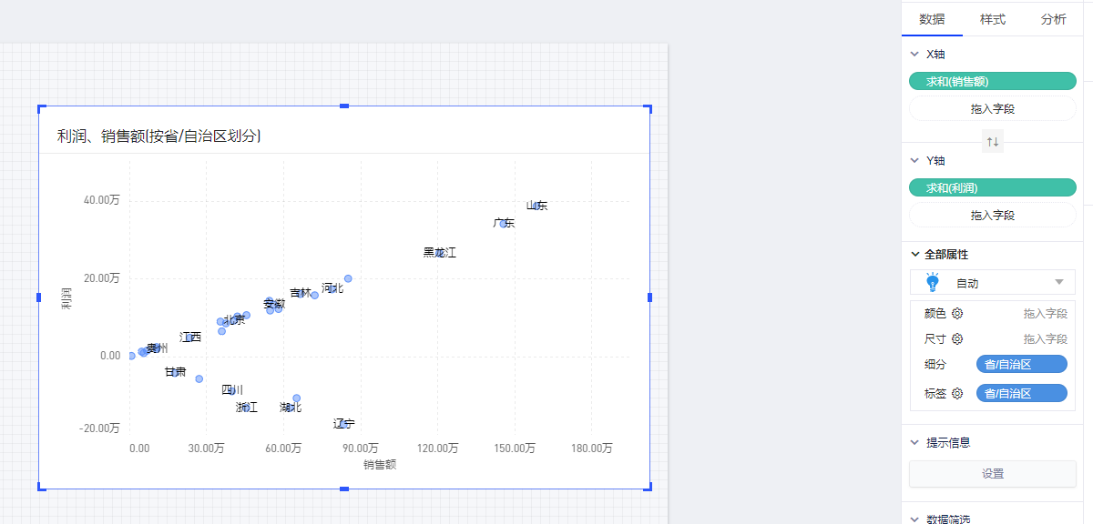 (2)在图表的数据面板的操作:将度量“销售额”放在X轴,度量“利润”放在Y轴,然后将维度“省”放置在细分,即可自动得到散点图;