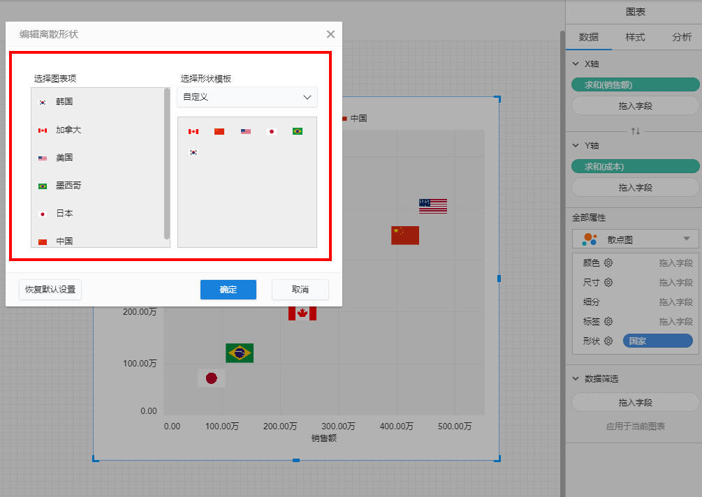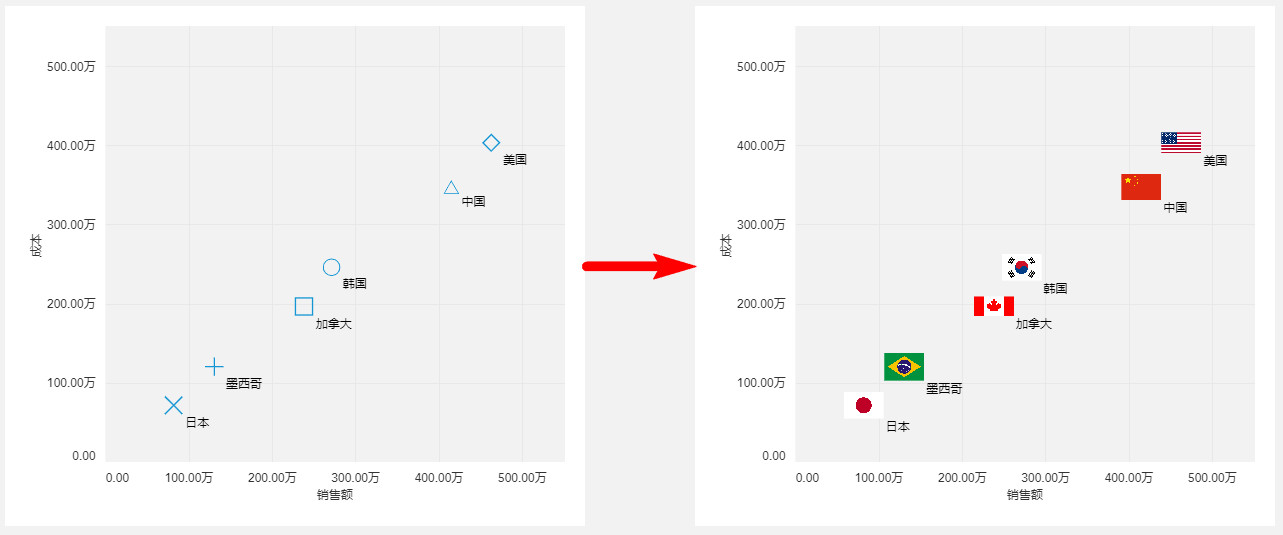 散点图还可以上传自定义图片作为点的形状,示例如图所示,用国旗代表国家,比原始的散点图会更直观: