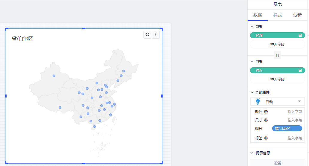 (2)在图表的数据面板的操作:双击字段列表区中的字段“省/自治区”,则X轴会自动添加“经度”,Y轴会自动添加“纬度”,属性面板中的细分会自动添加“省/自治区”,此时图会自动生成一张“标记地图”;