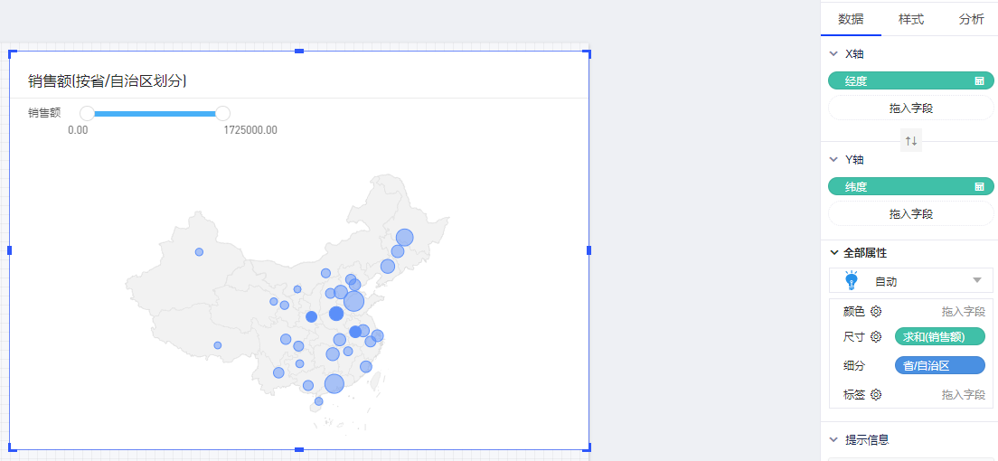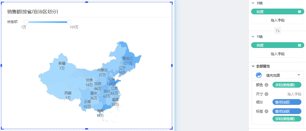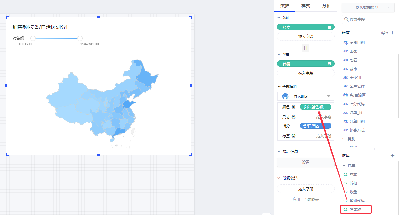 以默认数据模型为例,在地图上显示各个省份的销售额情况,将涉及到2个字段: 维度“省/自治区”,度量“销售额”。