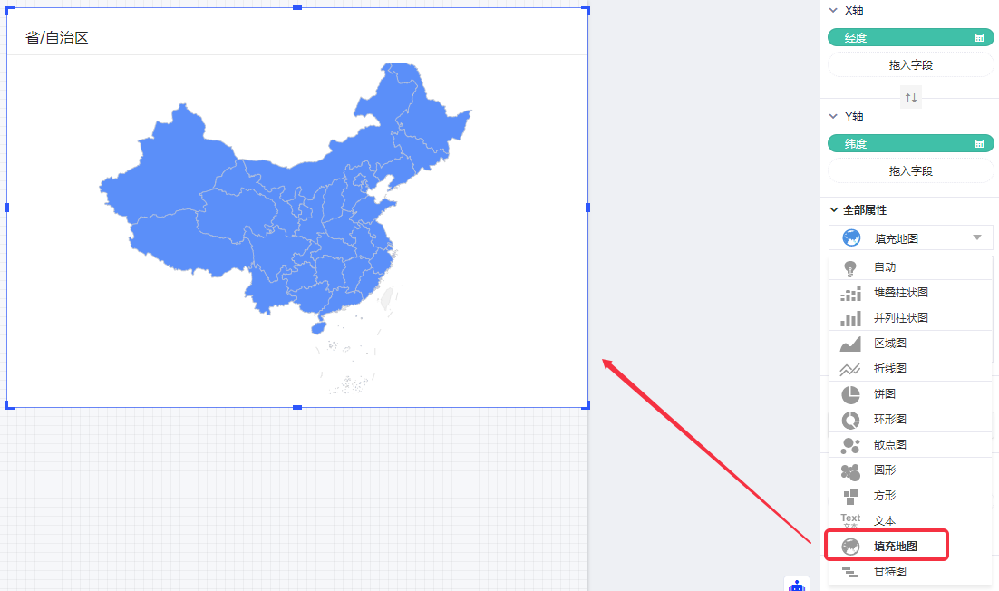 (3)属性面板中图表类型选择“填充地图”;