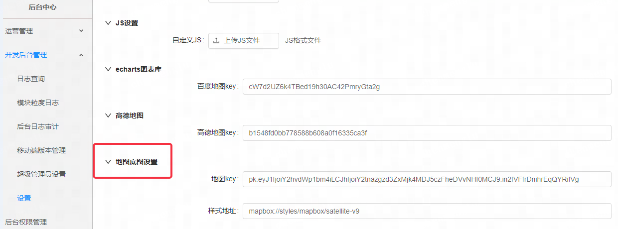 • 您可以在后台管理 - 设置 - 外观设置 - 地图底图设置中,自定义【地图Key】和【样式地址】: