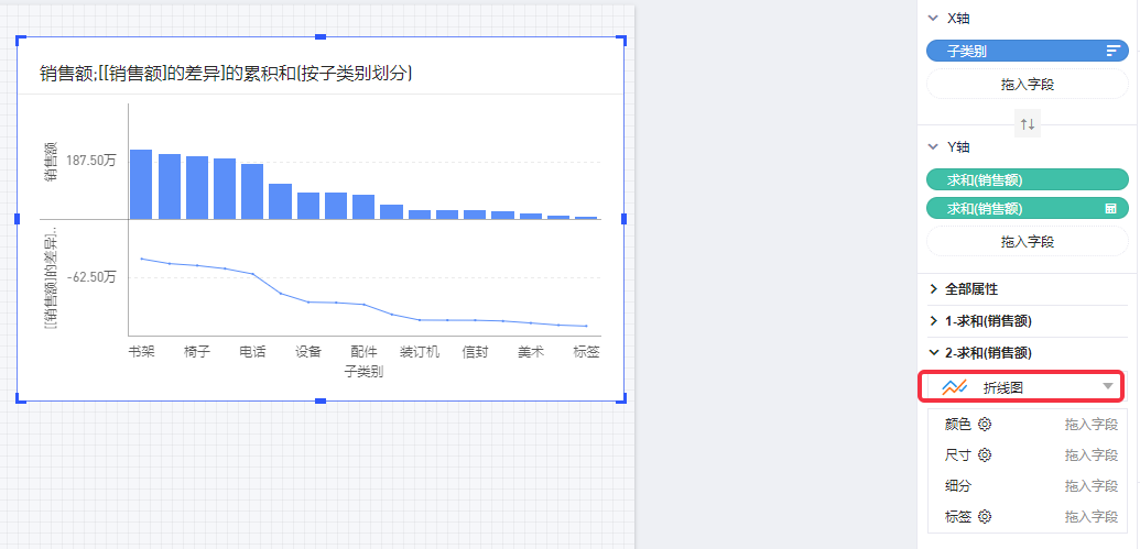 (7)点击打开第二个“销售额”的属性面板,将图表类型改为“折线图”;