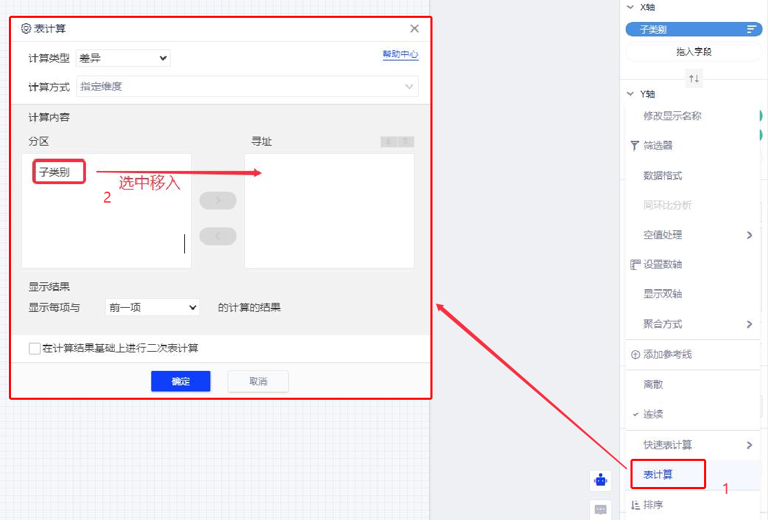 (5)选择Y轴的第二个“销售额”,鼠标Hover在字段上,点击下拉菜单,选择下拉菜单中的“表计算”,在表计算窗口中,选择“总额百分比”,将“子类别”放入寻址中;