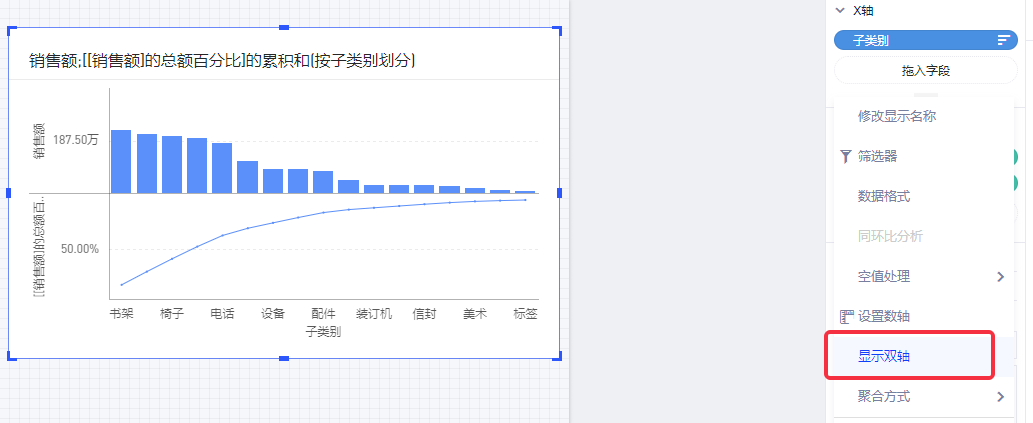 (8)选择Y轴的第二个“销售额”,鼠标Hover在字段上,点击下拉菜单,选择下拉菜单中的“显示双轴”;