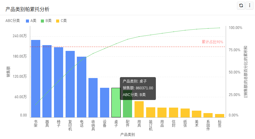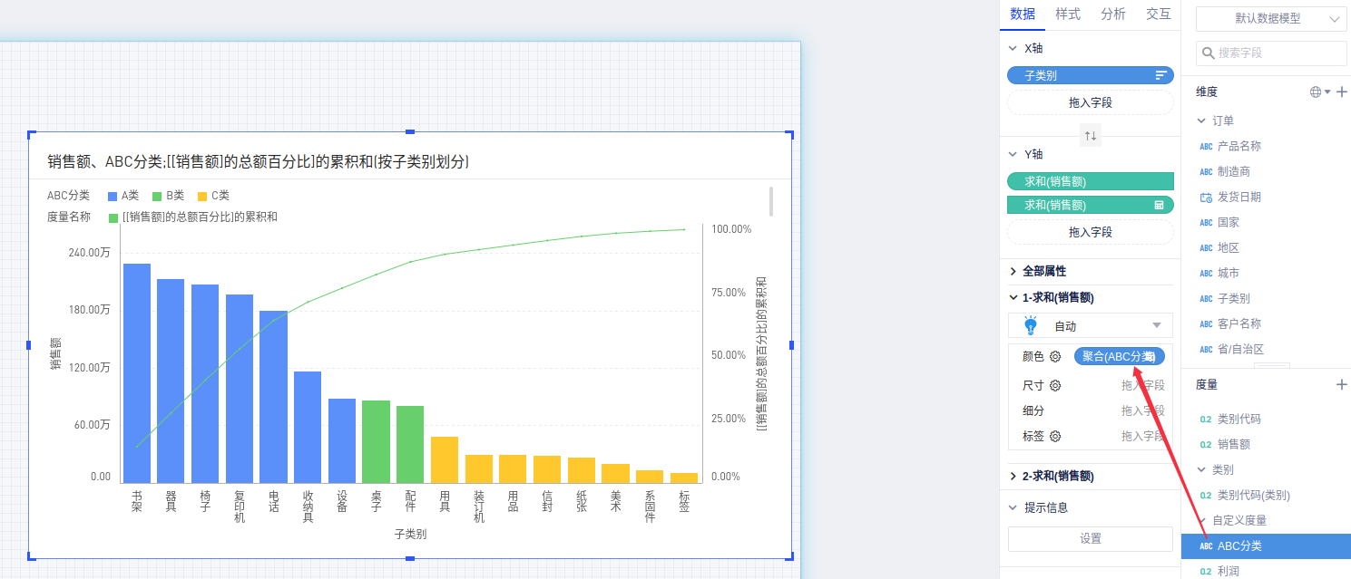 我们以默认数据模型为例,按照产品累计销售额占比划分产品类别,80%以内的为A类,80%-90%的为B类,90%-100%的为C类。