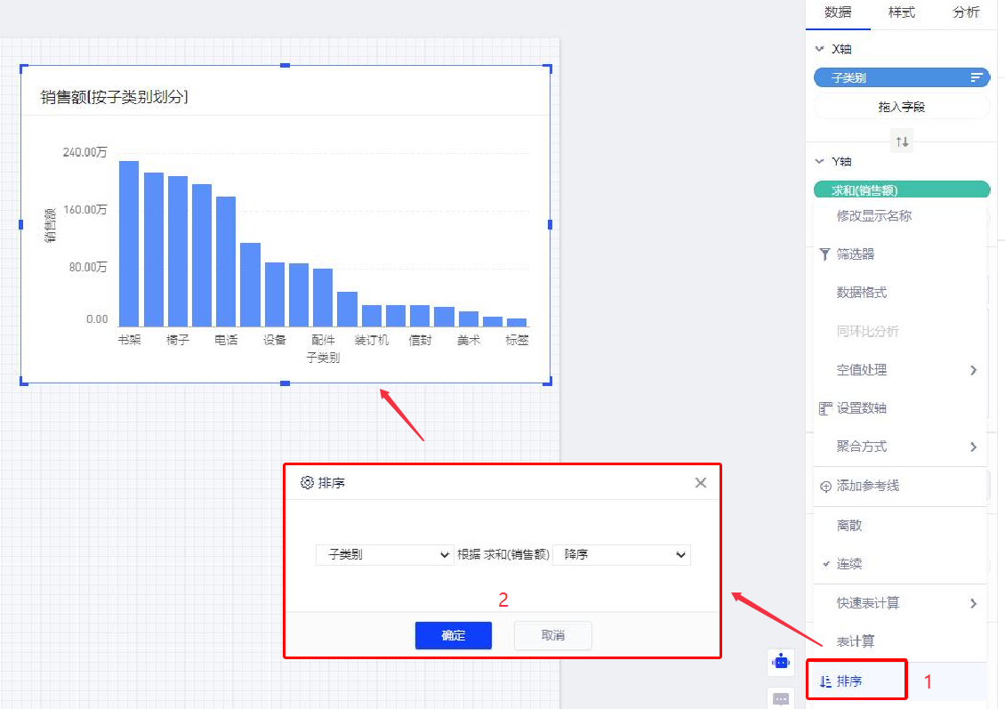 (3)选择Y轴上的“销售额”,鼠标Hover在字段上,点击下拉菜单(也可右键呼出),选择下拉菜单中的“排序”,然后在排序窗口中,选择降序,得到降序的柱状图;