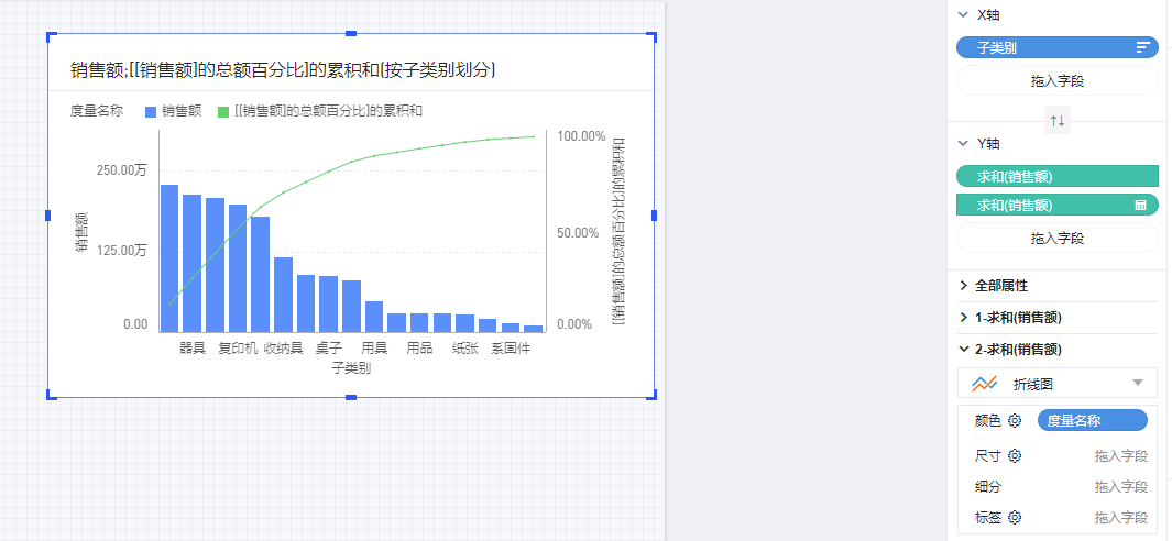 打开报告编辑页面,引入默认数据模型,将涉及到2个字段:维度“子类别”,度量“销售额”。会涉及到排序,表计算中的总额百分比和累积和。